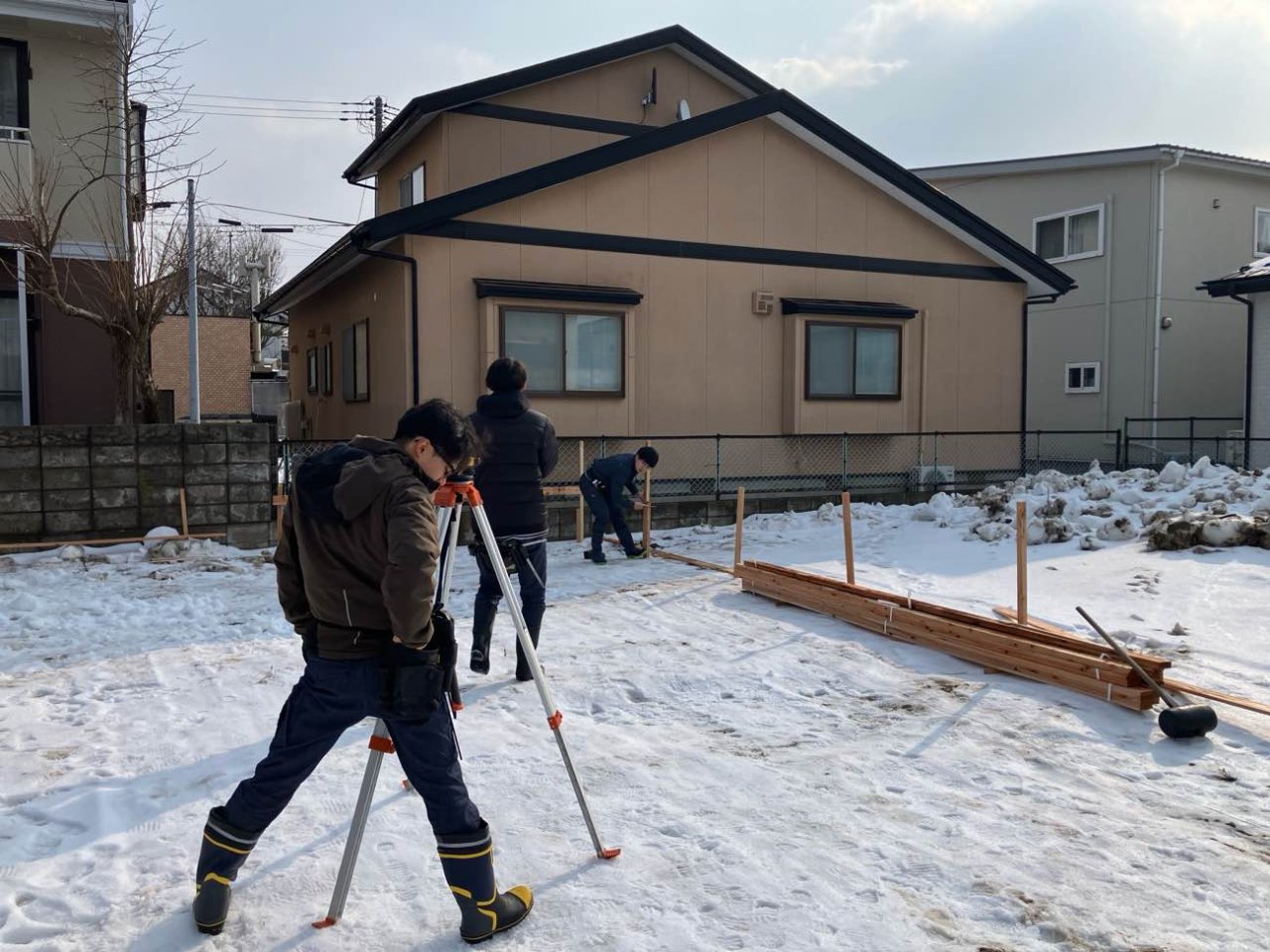 着工の第一歩となる「丁張り」の日は、これまでの雪空が嘘のような快晴!