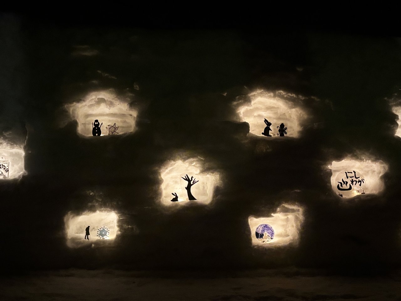 夜には雪壁にランタンが灯り、切り絵のような影絵が幻想的な夜を演出。
