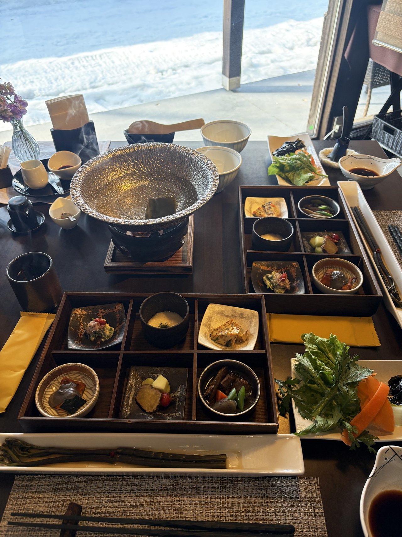 翌朝は、湯気が立ちのぼるお鍋と、地元の味が少しずつ並んだ滋味あふれる朝食で健やかな目覚めを。