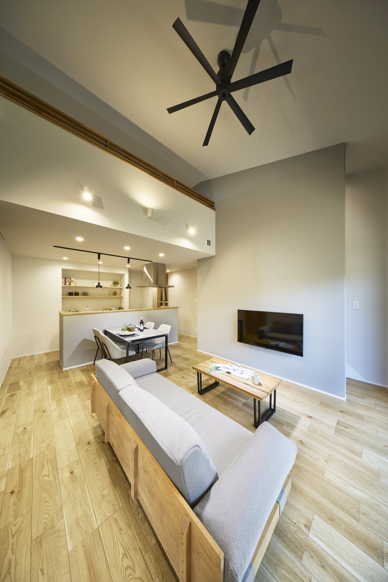 リビングは木の素材感と高天井に癒されるゆったりとした