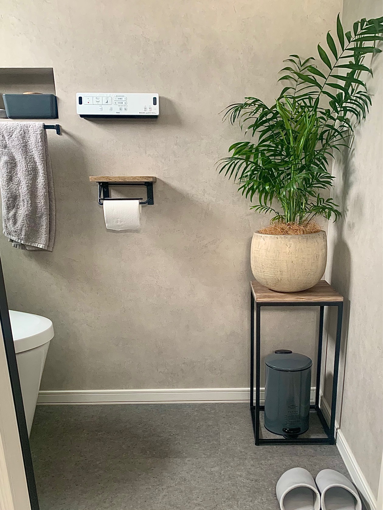 モルタル調のクロスを貼って、無機質な空間にした2階トイレですがちょっと物足りなかったのでアクセントにテーブルヤシのテーちゃんを置きました!