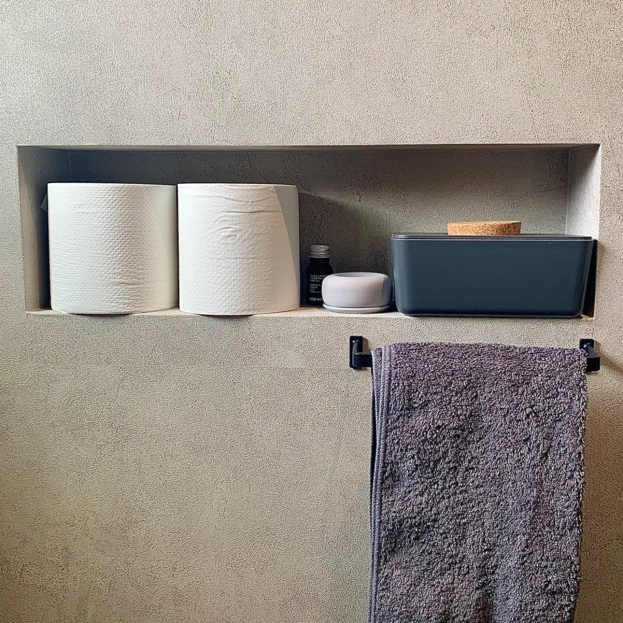 また、工務さんに相談して作ってもらったトイレットペーパーを収納するニッチにはトイレットペーパーだけでなく無印のアロマストーンを置いたらなんだかいい感じになりました(笑)