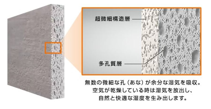 また、 『エコカラットプラス』は表層に超微細構造層を設けることで、湿気などの細かい粒子は通し、粒子の大きい水や汚れは通しにくい構造となっています。この構造により調湿する壁でありながら水拭きで簡単にお手入れすることができます。