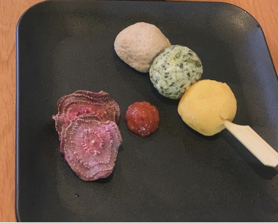 このお店はわんちゃんメニューも豊富で鶏むね肉と野菜の三色肉団子を注文しました。