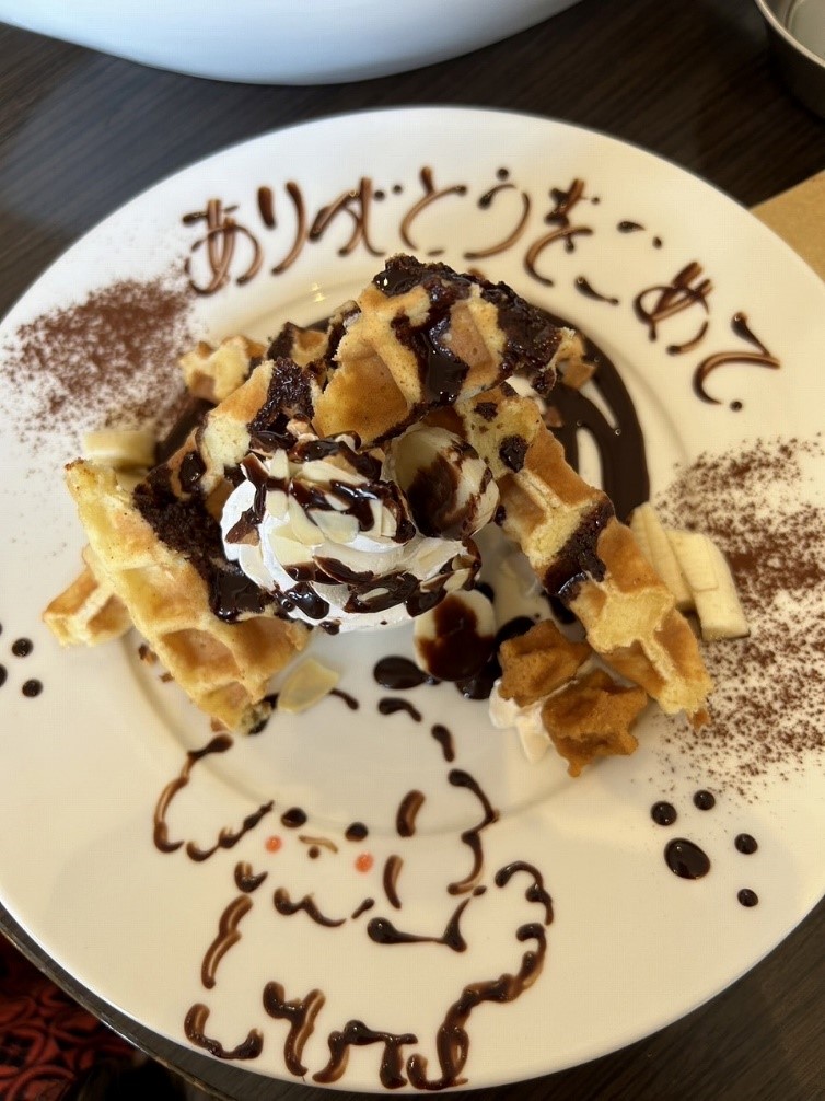 私はカレークリームパスタ、妻はワッフルを注文して、