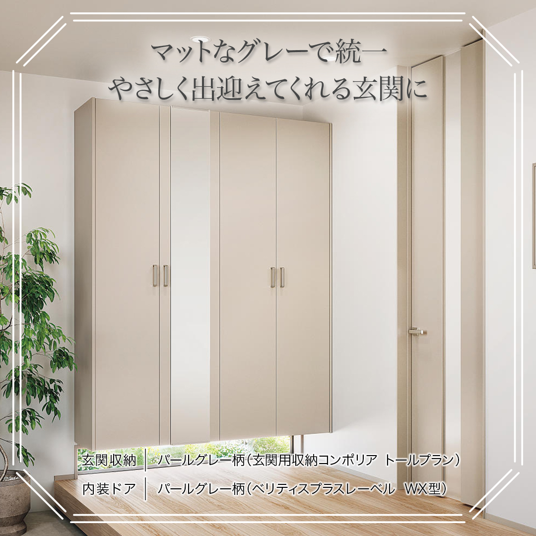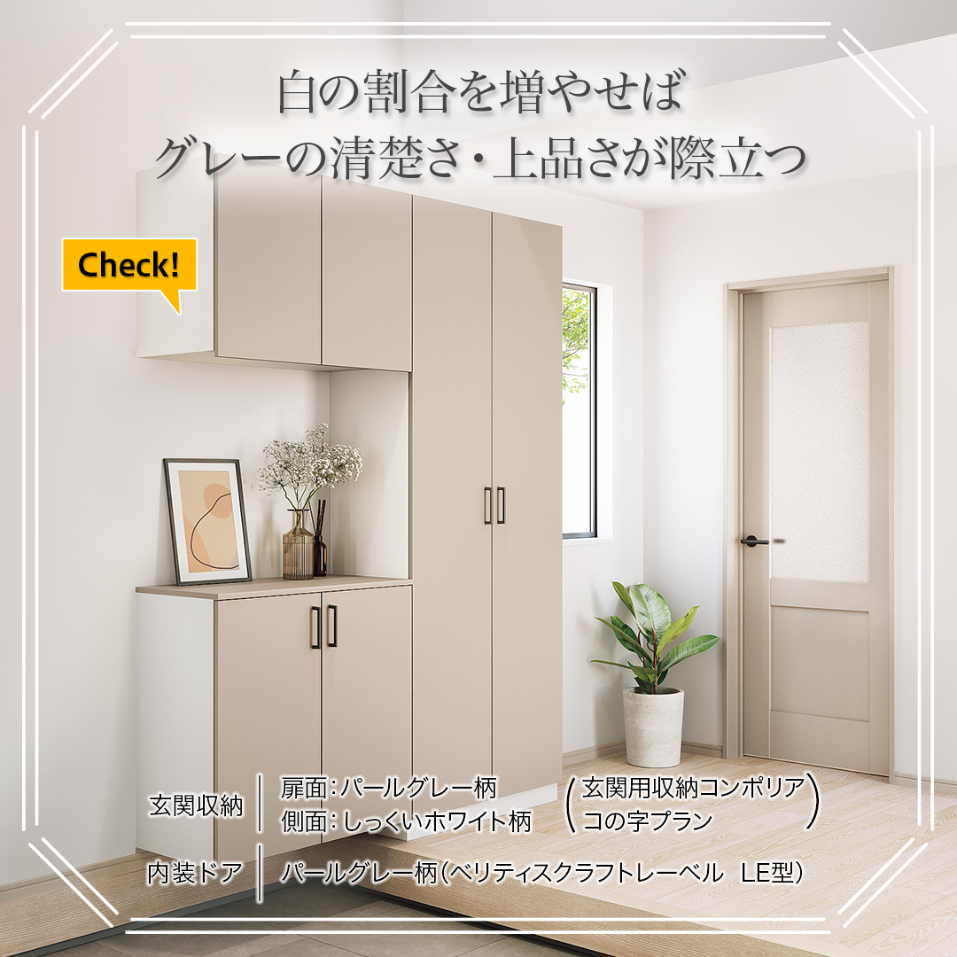 扉に「#パールグレー柄」、側面に「#しっくいホワイト柄」を取り入れれば、パールグレーの持つ上品な印象をさらに引き出せます。
