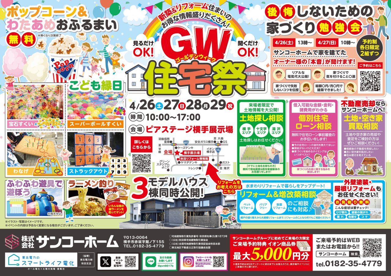 4/26(土)~4/29(祝)の期間は、ピアステージ横手展示場にて「GW住宅祭」を開催中です!