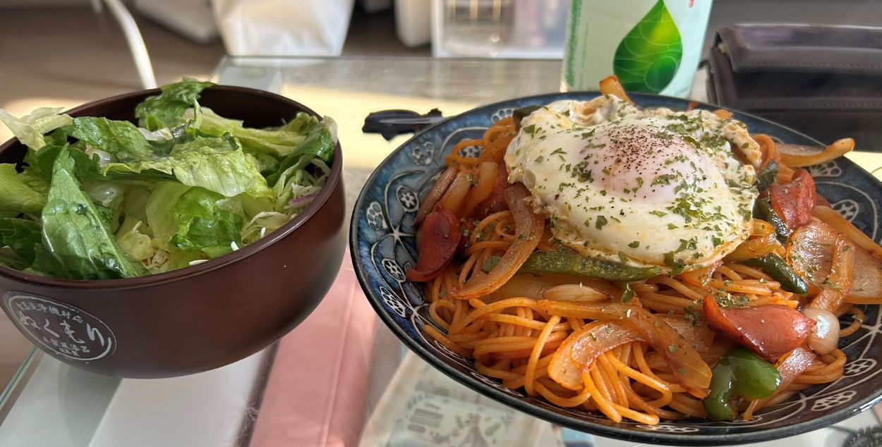 ケチャップベースの味付けに、半熟卵のとろみが絡んでこれも大満足。サイドにレタスとキャベツのシンプルなサラダを添えて、ちょっとカフェ気分も味わえました。
