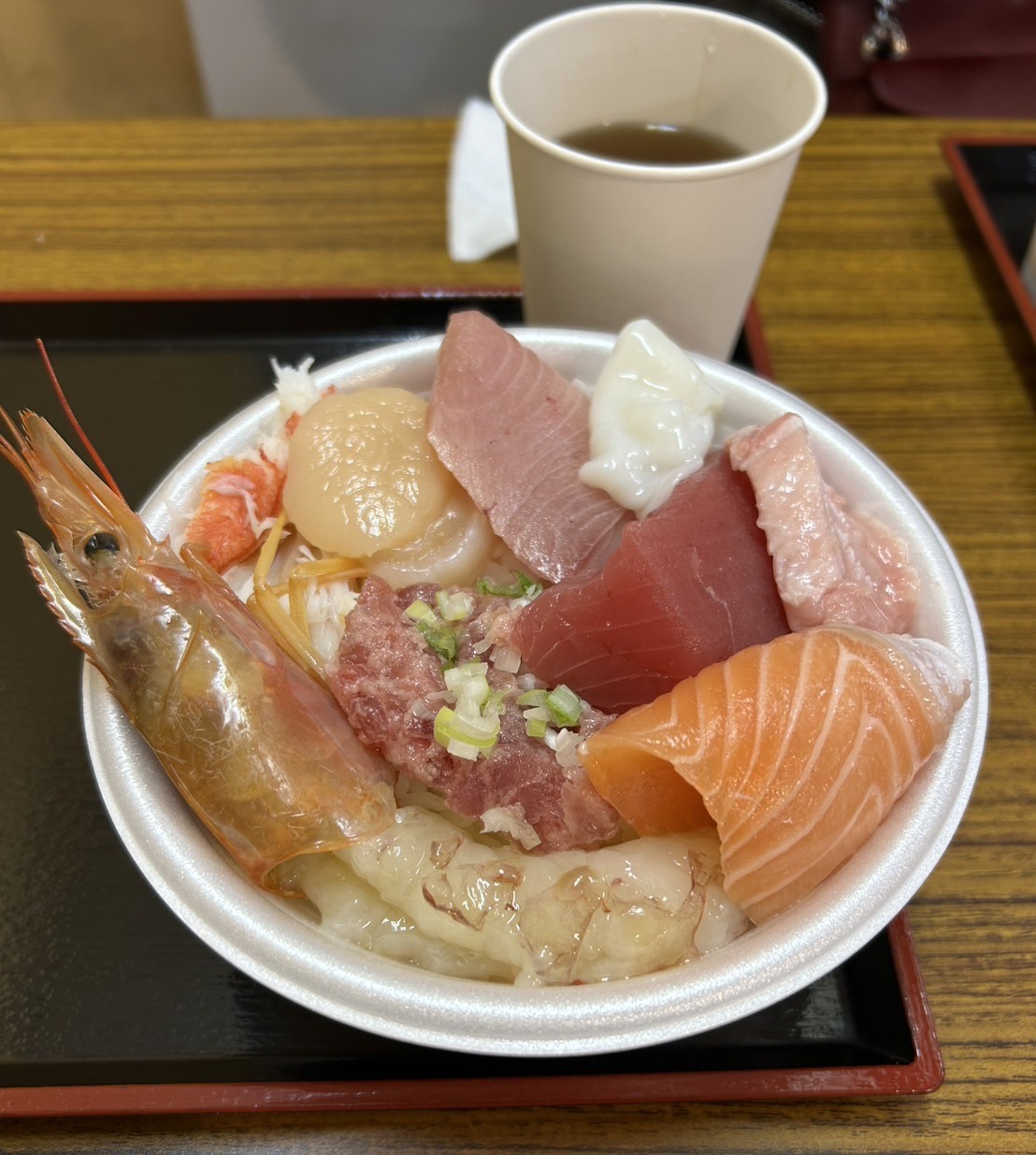マグロ、サーモン、ホタテ、エビ、ネギトロ、イカ、エビ、カニ……これでもかというほど乗せてしまいボリュームのある、海鮮丼が完成しました(笑)