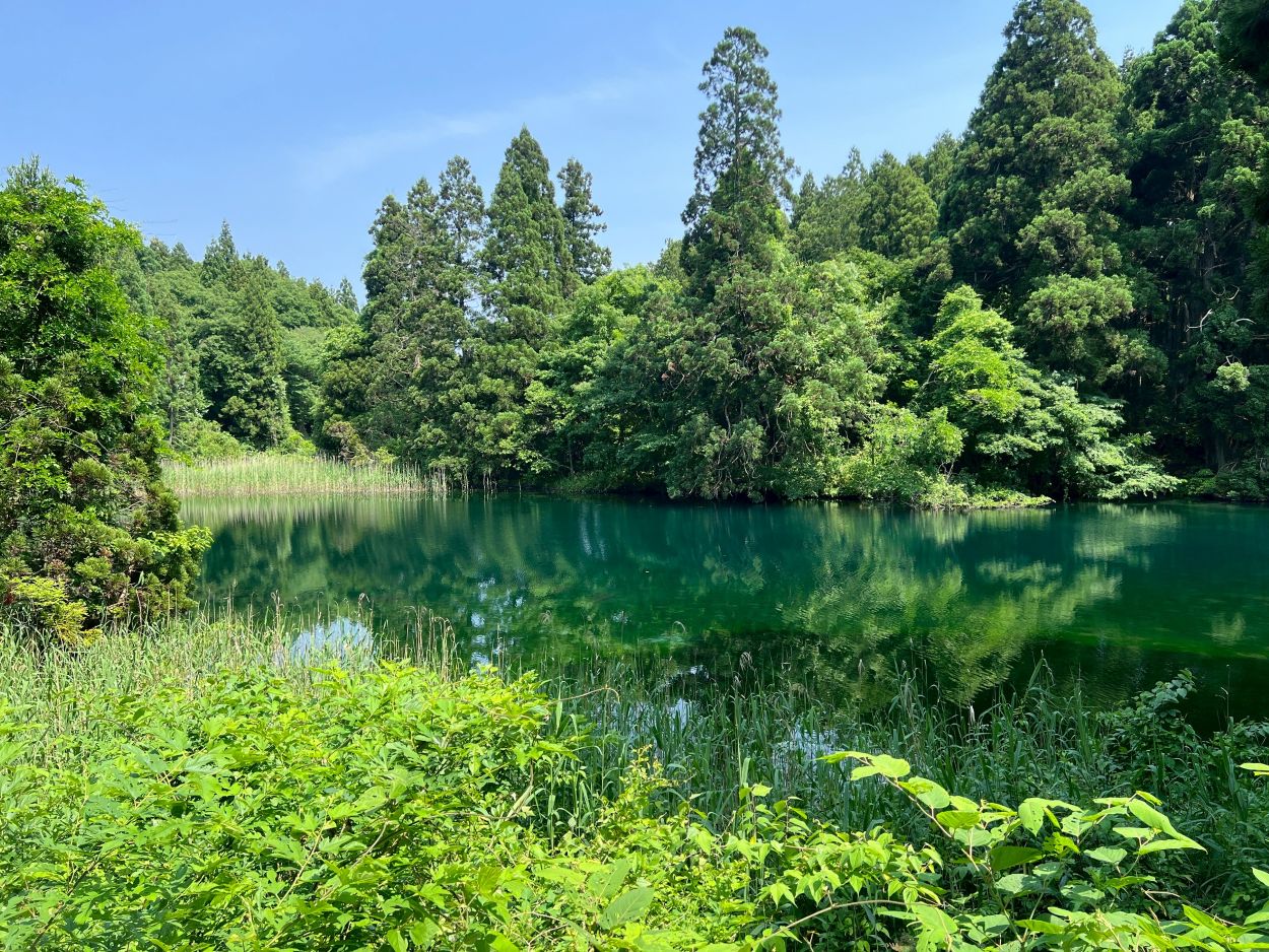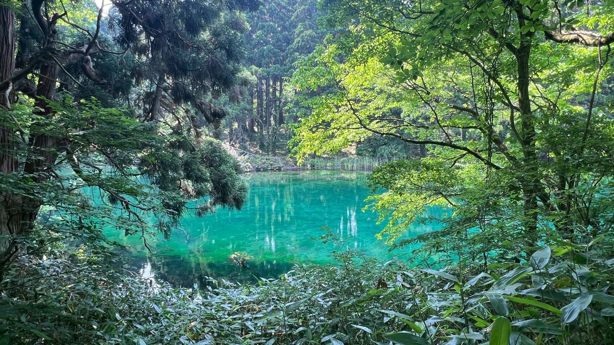 コースの奥へ進むと、目の前にはエメラルドグリーンの美しいため池が広がり、その鮮やかさに思わず見入ってしまいました。