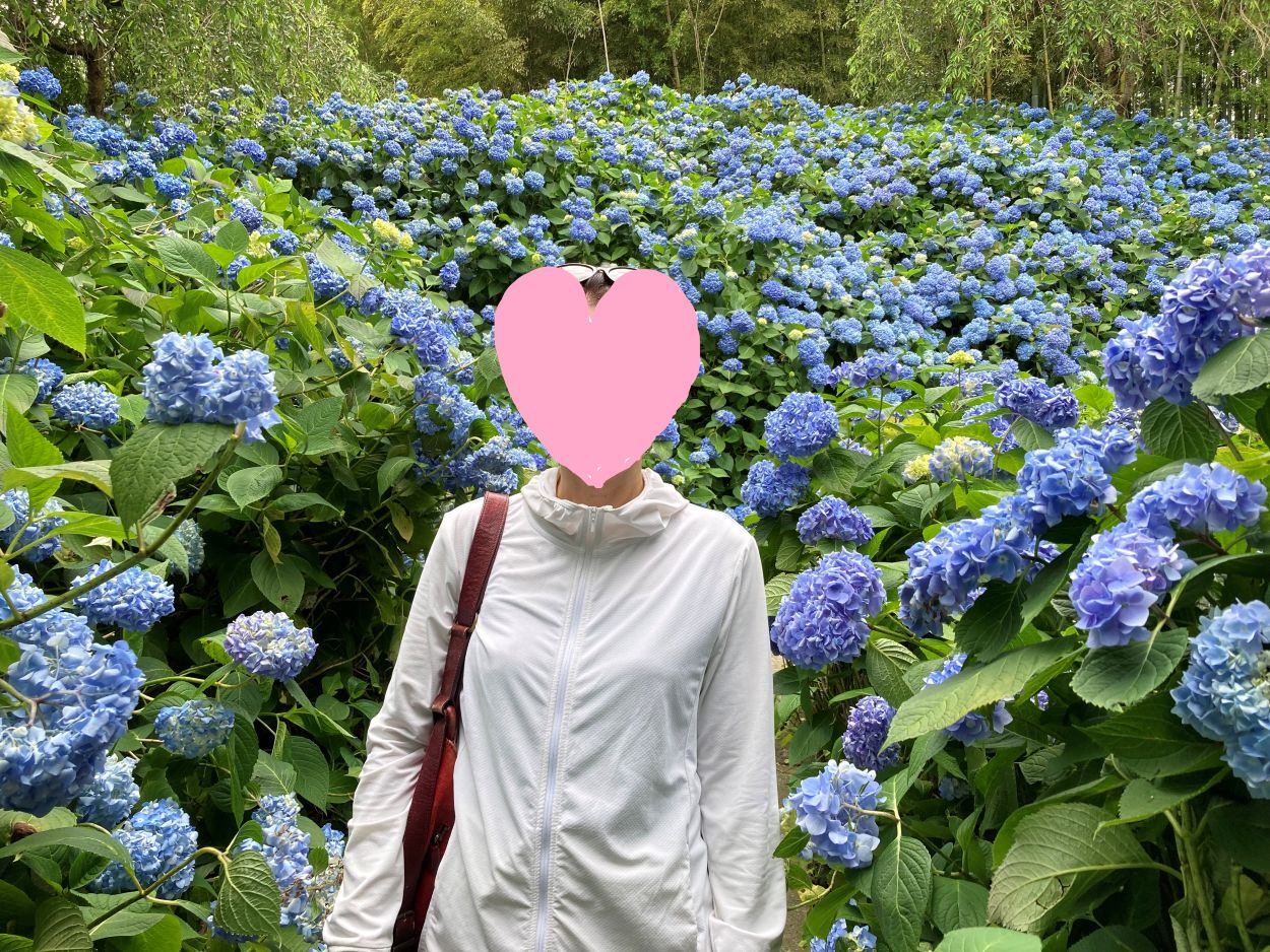 紫陽花に埋もれるようにして記念写真をぱちり。来年の年賀状に使えるかな。