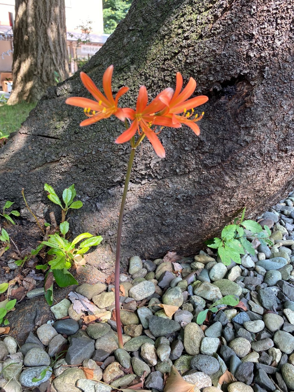 そこには八月になるとお稲荷さんのそばの期の根元に「キツネノカミソリ」と言う花が咲きます。皆さんはご存じですか?見ると可愛い花ですよ。来年でもいいので思い出したら探してみてください(笑)。