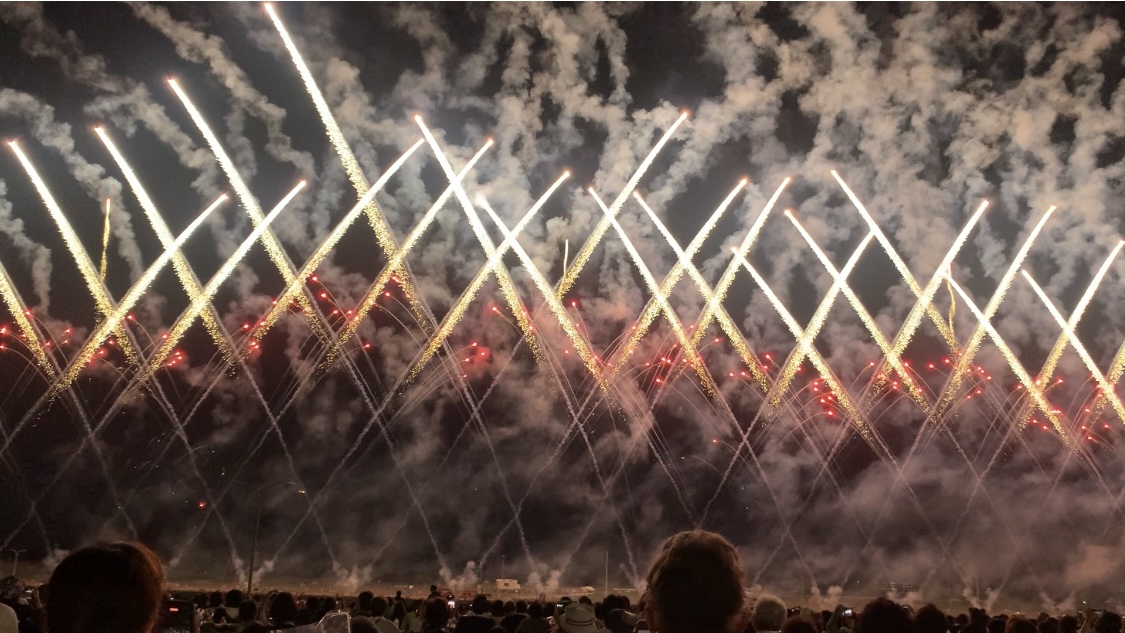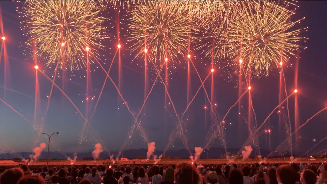 能代の花火は打ち上げ時間が19時半〜21時とやや短いものの、ほぼワイドスターマインで大曲の大会提供並みの鳥肌のたつ圧巻なスターマインが3回くらいあがります!