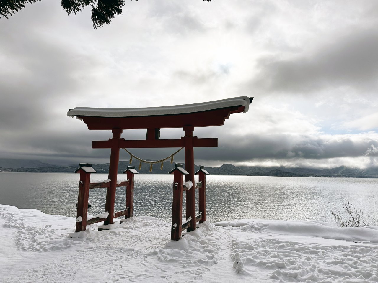鳥居のすぐ先は湖で、鳥居の下に立って自然のパワーを頂いてきました。
