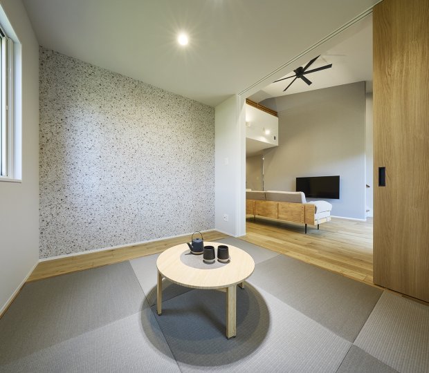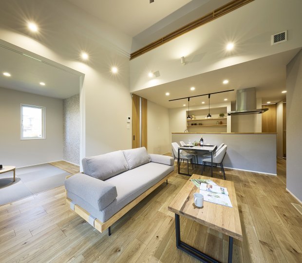 リビングの横にはウッドデッキがあり、外空間とのつながりも楽しむことができます。 -