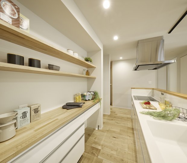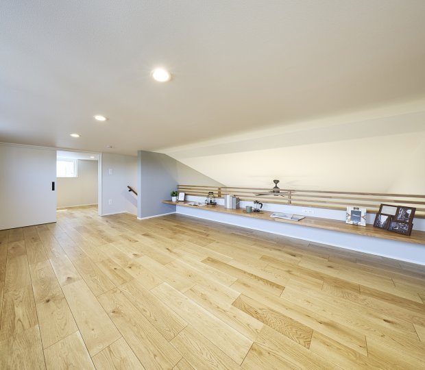 書斎や趣味スぺースとして使えるカウンターと、両サイドに収納スペースを配置しています。 -
