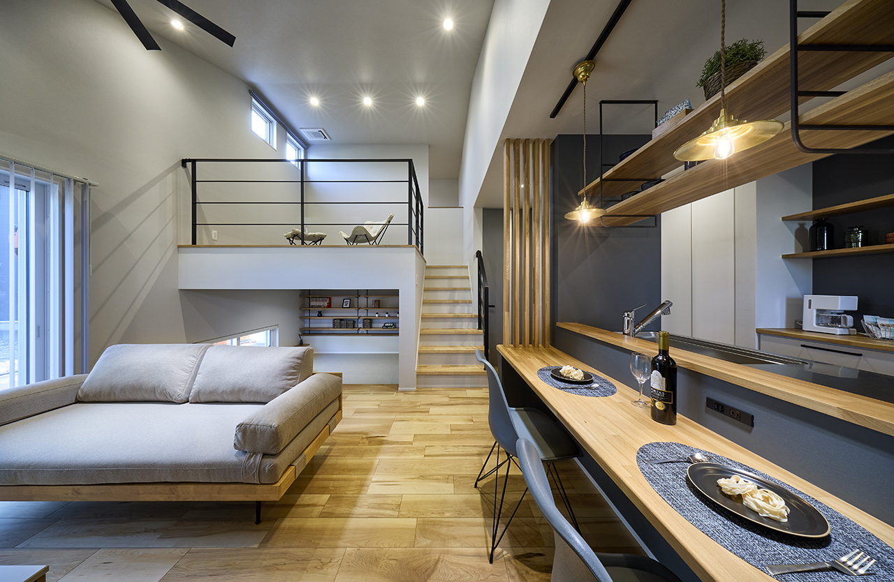 勾配天井とロフトスペースのある