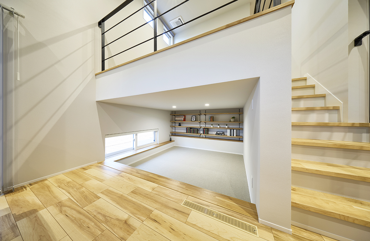 家族がくつろぐリビング空間を見渡せるスキップフロア