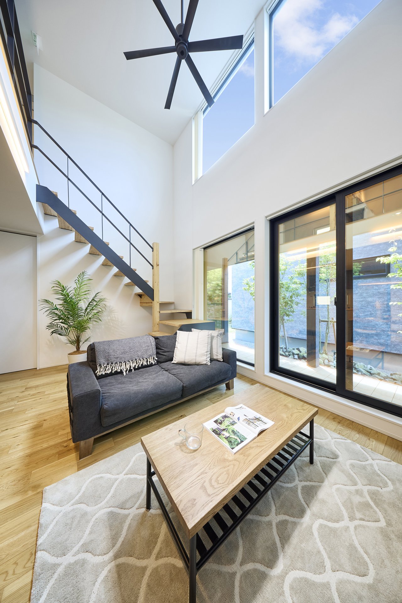開放的な吹き抜けとウッドデッキで