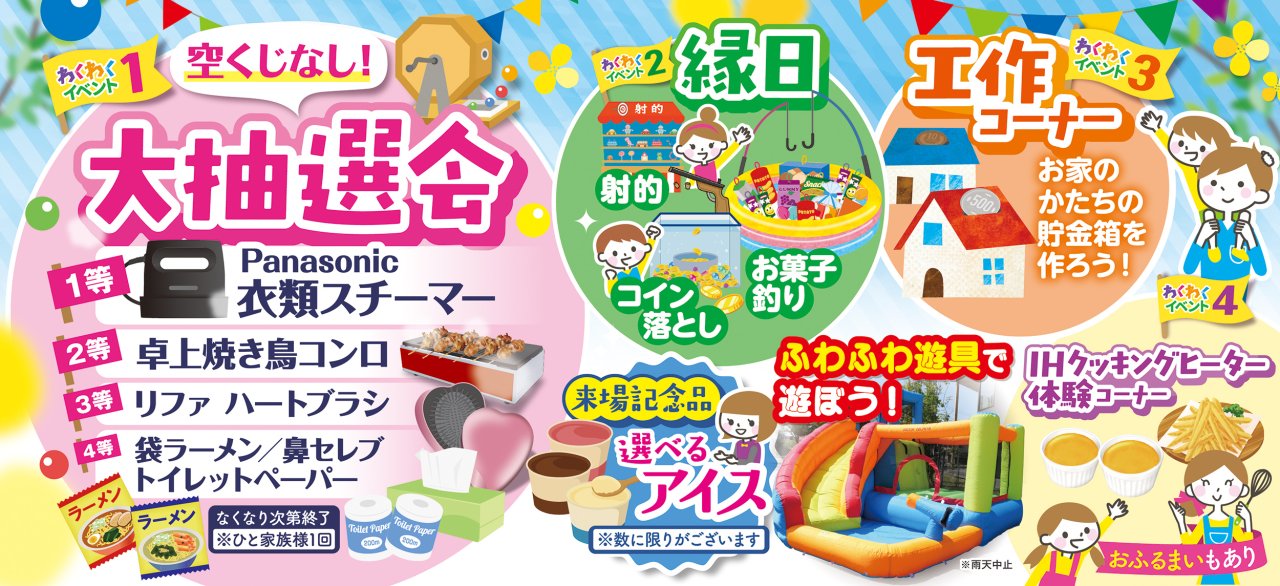 会場では、空くじなしの大抽選会や縁日、おふるまいなど、家づくりのご相談だけでなく、お子様から大人まで楽しめるイベントが盛りだくさん!