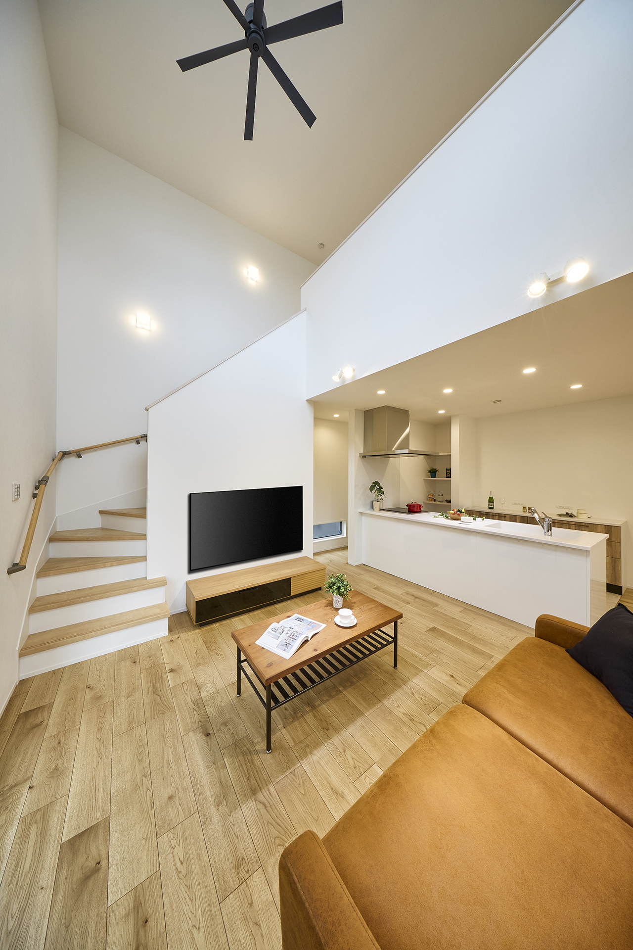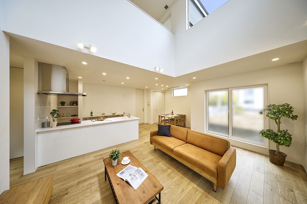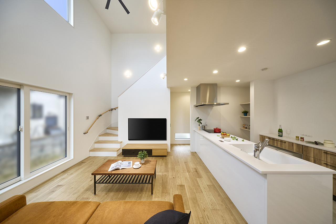 広くて住み心地の良い家づくりにこだわりました。リビングを吹き抜けにし、天井近くに設けた2つの窓から自然光が入り込むようにしました。白を基調とした室内デザインも明るさと開放感が感じられます。フラットキッチンにすることでリビング・ダイニングがより広々とした空間となり、キッチンから子どもの様子を見守りやすいところも気に入っています。