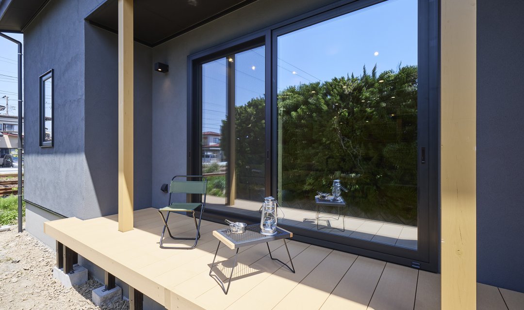 リビングの横にはウッドデッキがあり、外空間とのつながりも楽しむことができます。 -
