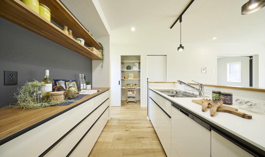 キッチンのすぐ隣にパントリーと洗面所を配置。