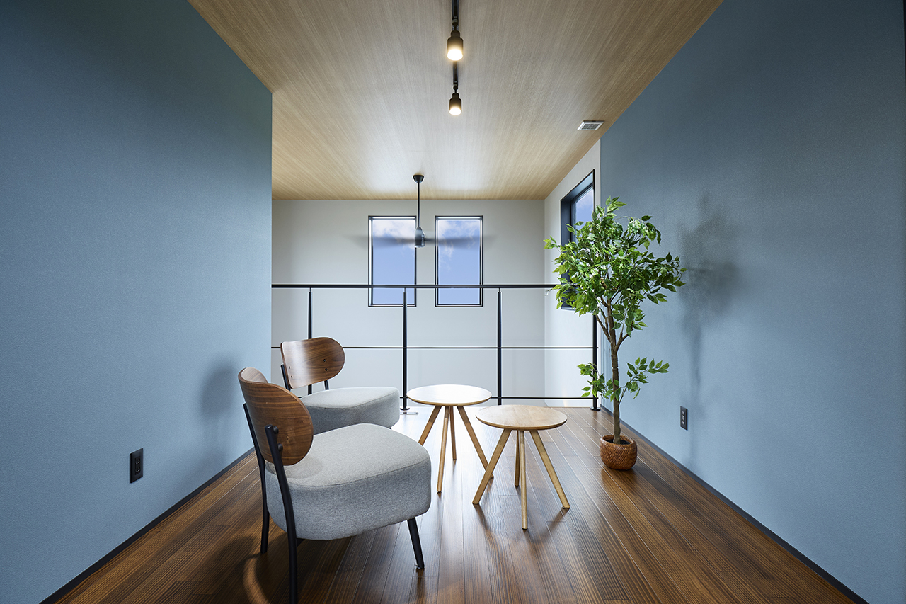吹き抜けと落ち着いた青い壁紙が心地よい空間を演出する2階フリースペース。