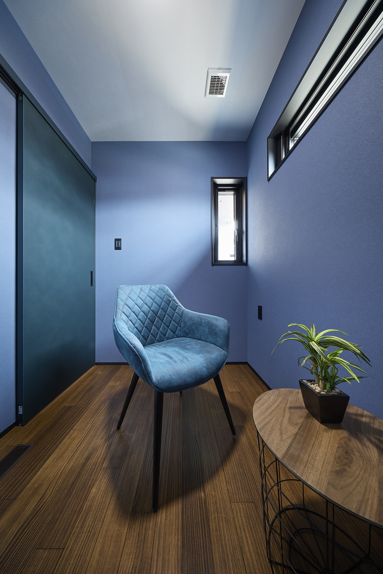 在宅ワークや趣味に集中できるシックなブルーに包まれる2.5帖の書斎。