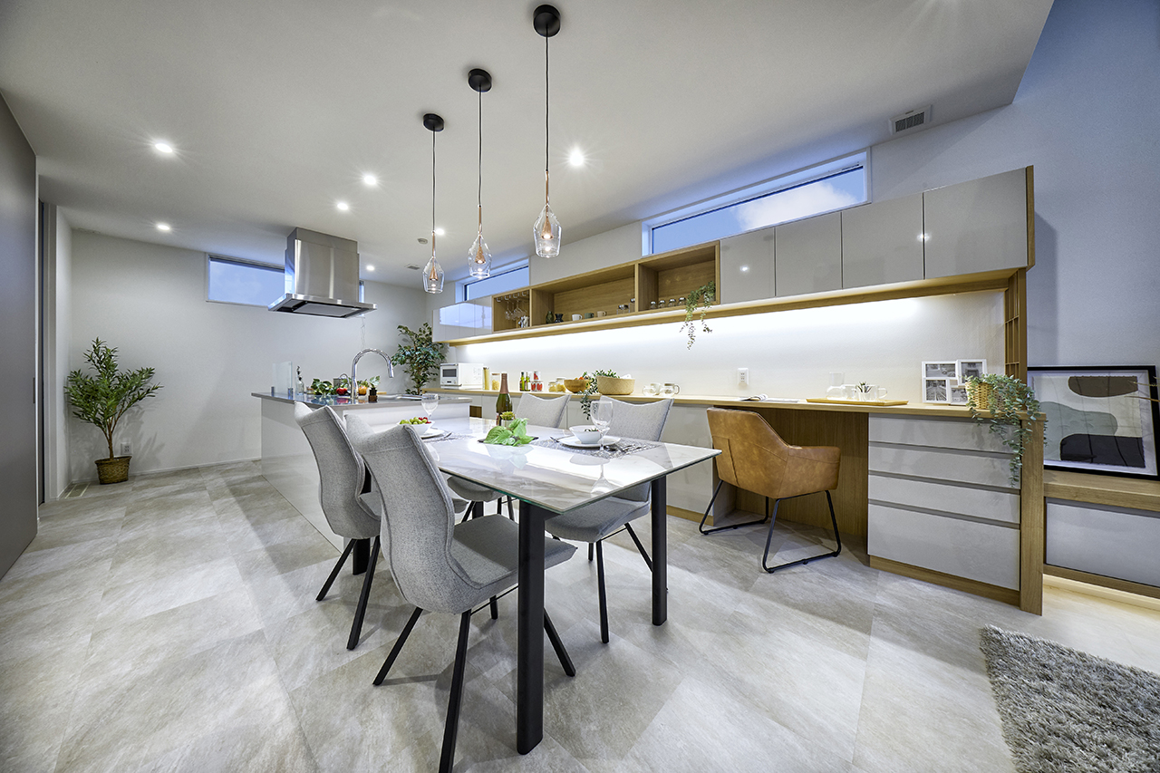 キッチン・ダイニング・リビングを一直線に配置することで、暮らしの動線が美しく整い、デザイン性と機能性を両立したホテルライクな空間に仕上がっています。