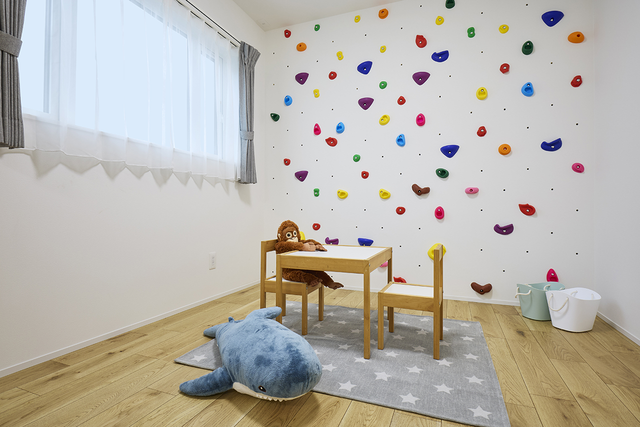 壁の一面にボルダリングスペースを設けた、遊び心あふれる子ども部屋。