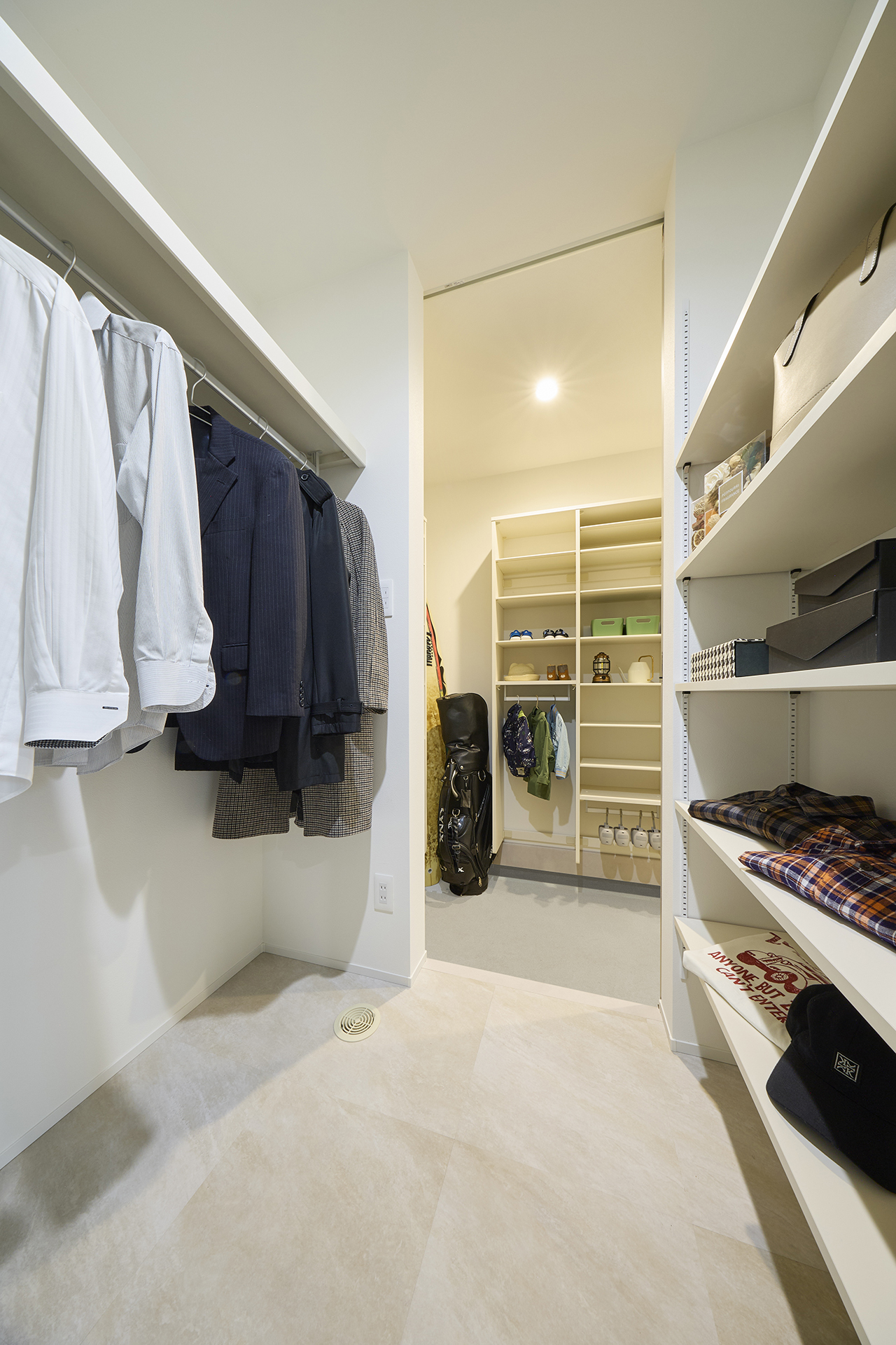 シューズクロークと洗面所の両方からアクセスできる回遊動線が魅力のファミリークローク。