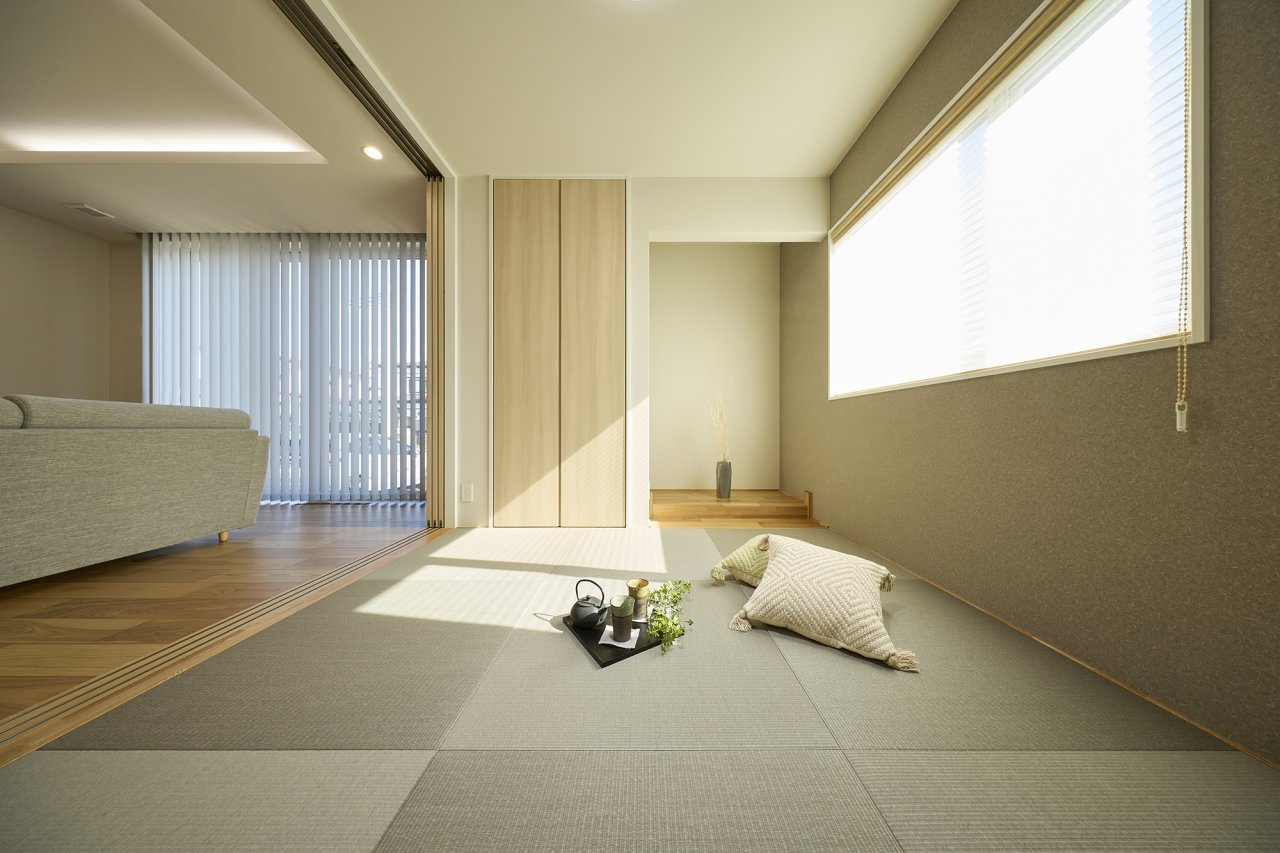 リビングとゆるやかにつながる続き間の和室は、グレーの琉球畳を採用したモダンな設え。