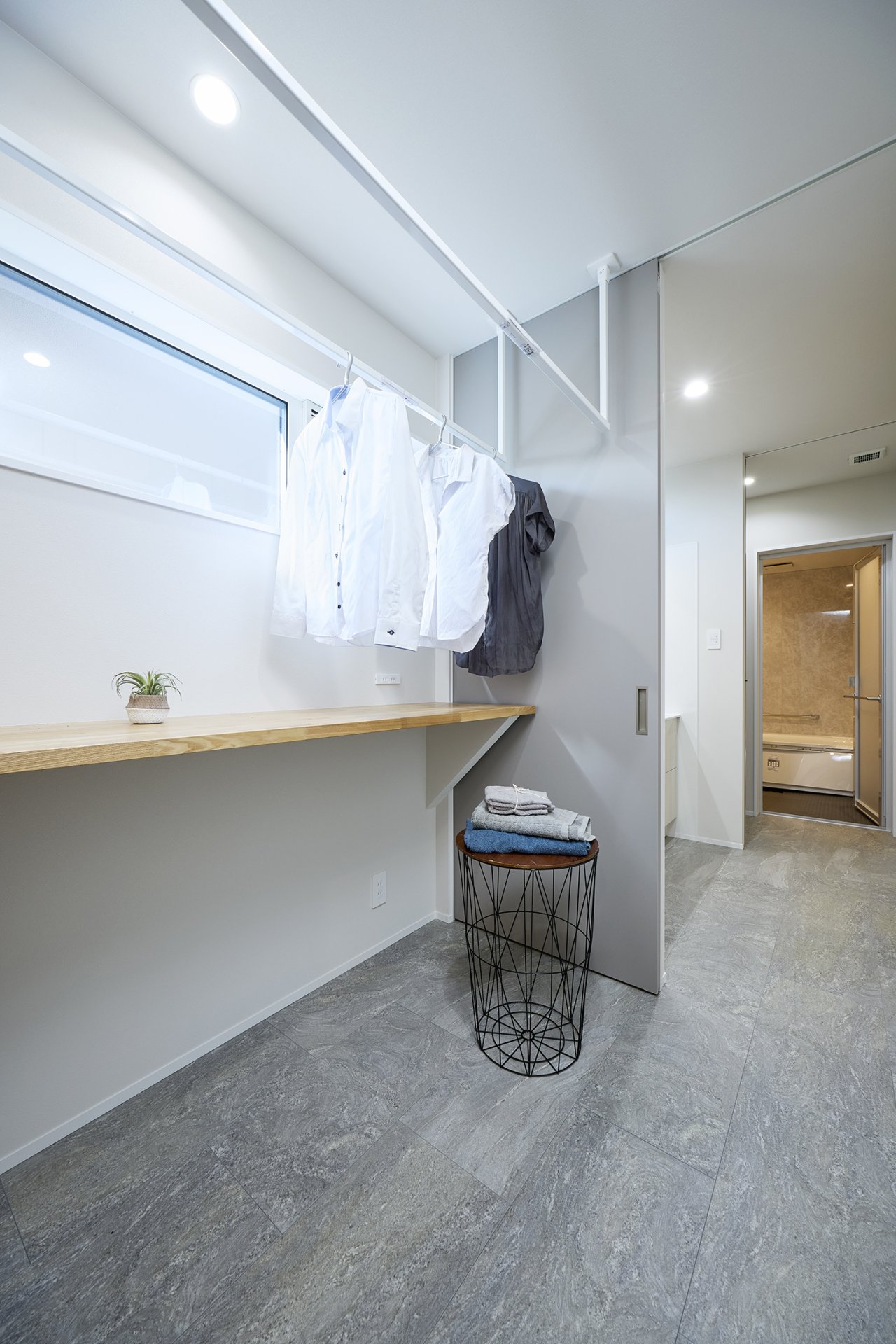カウンターと室内干し用のバーを備え、洗う・干す・たたむをスムーズに行える便利な空間です。