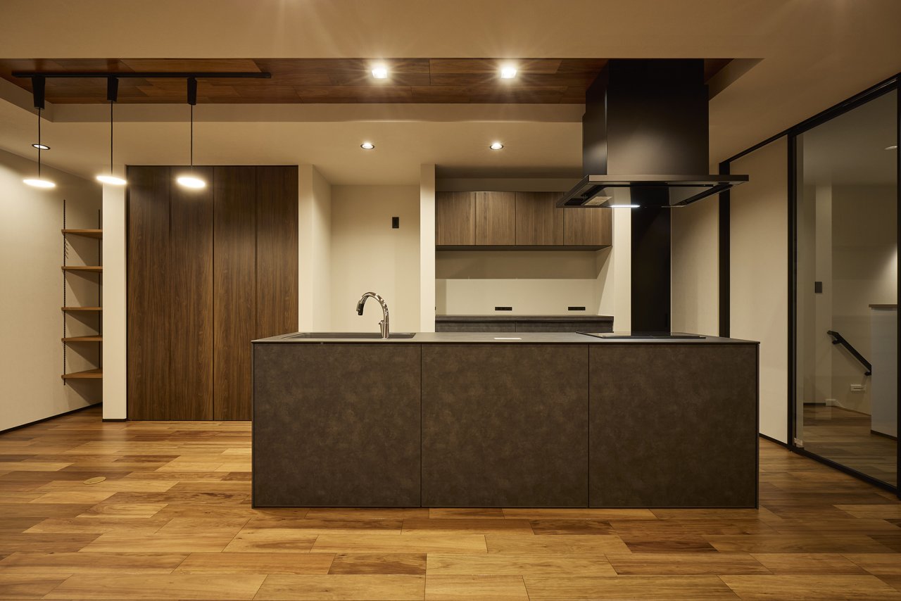 存在感のあるブラックスタッコ柄のアイランドキッチンを主役に据えた、デザイン性の高いキッチン空間。