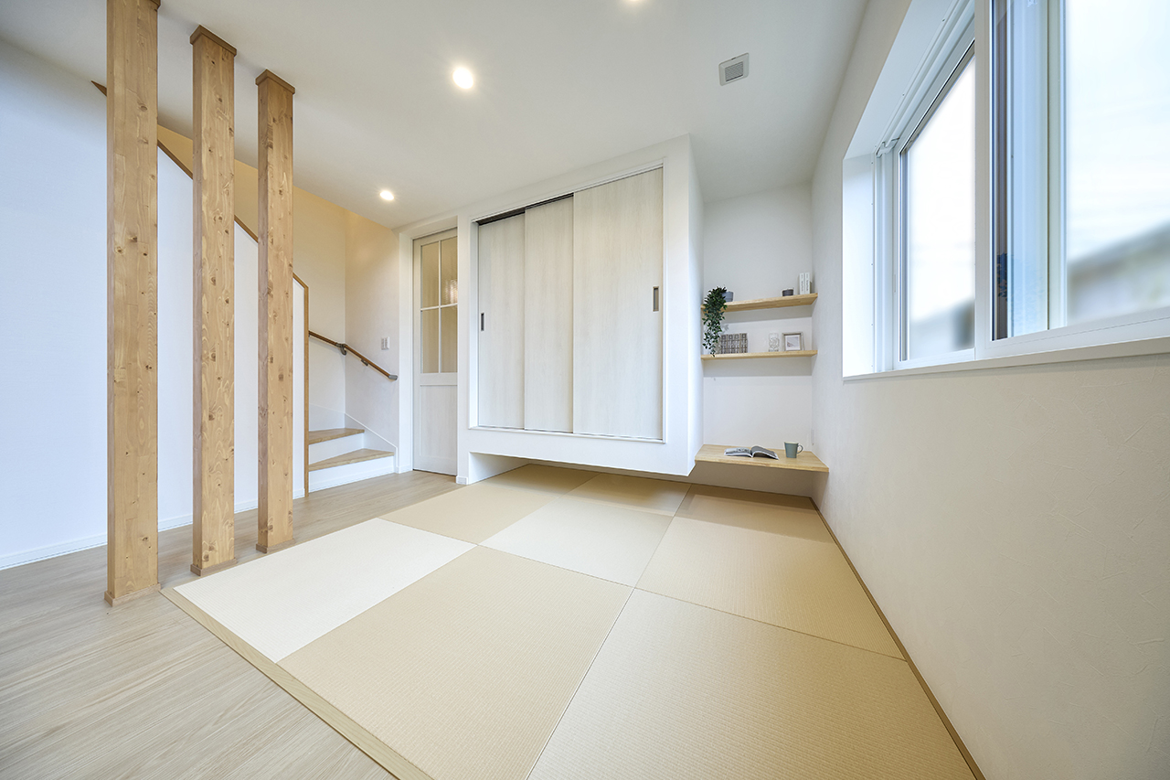 扉を無くしリビングと続き間で開放的に過ごせる和室。