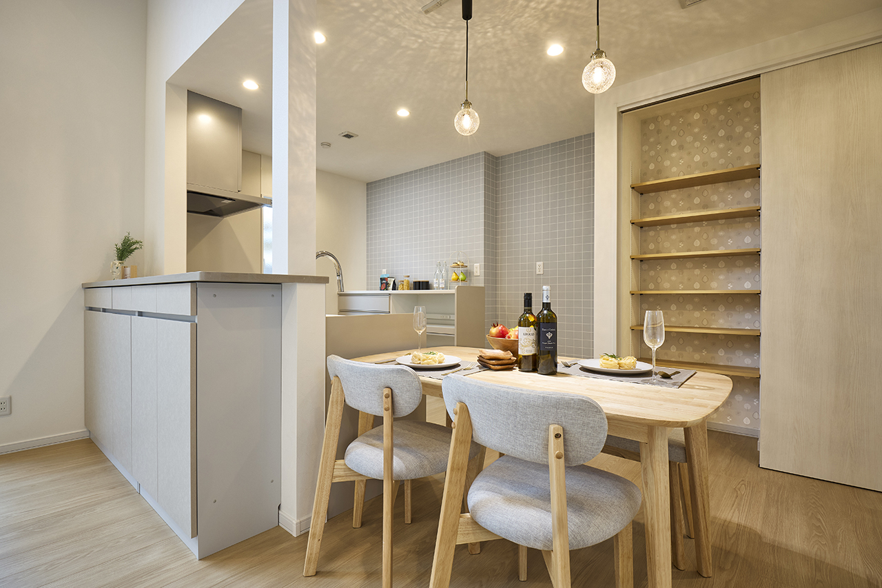 こだわりの照明とアクセントクロスがおしゃれなサイドダイニングのキッチン。