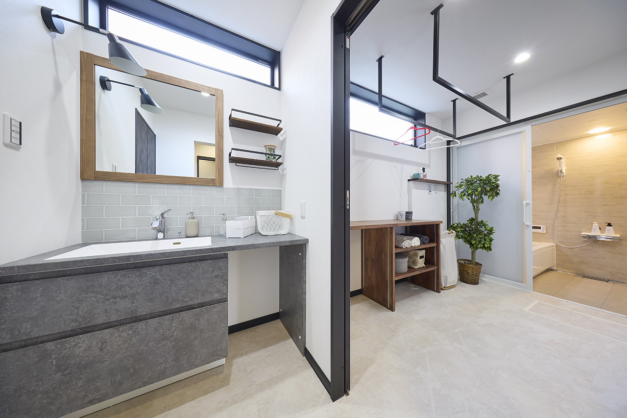 部屋干しスペースと洗濯物を畳めるカウンターを設けたユーティリティと、タイルをあしらったこだわりの造作洗面台。
